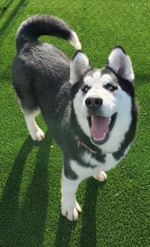 “Noodle” is a male Alaskan husky mix with a black and white coat.