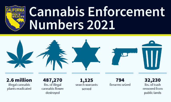 The California Department of Fish and Wildlife’s Cannabis Enforcement Program has released year-end numbers for the 2021 calendar year.