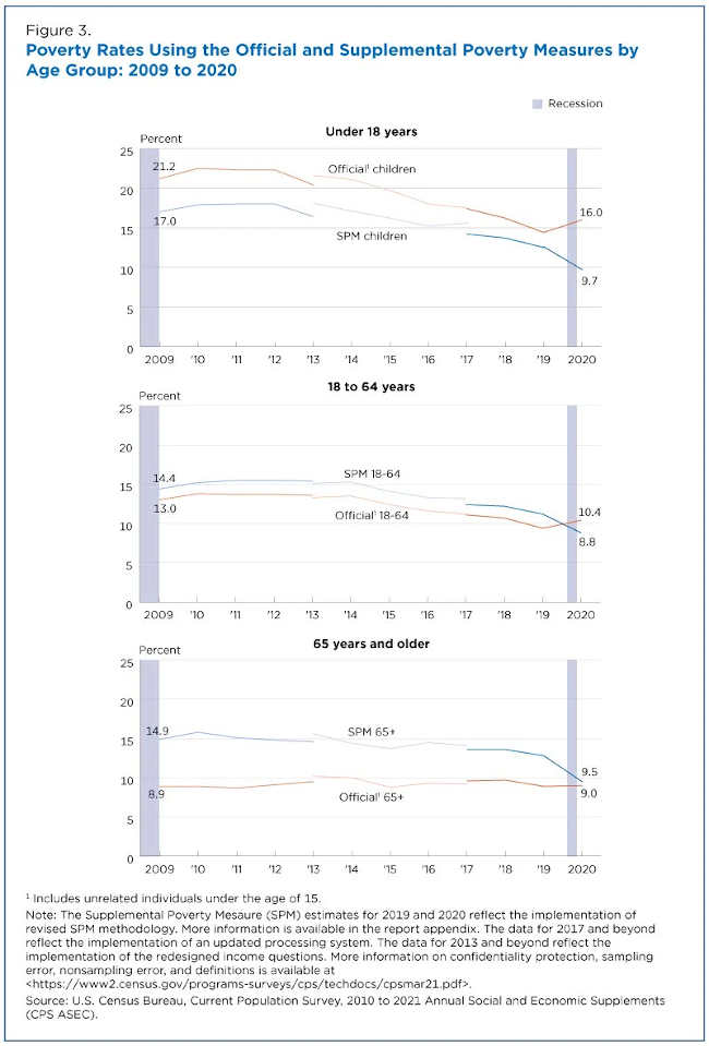 In September 2021, the Census Bureau released the 11th SPM report for 2020. The report presented estimates of both the official and Supplemental Poverty measures and outlined differences between the two.