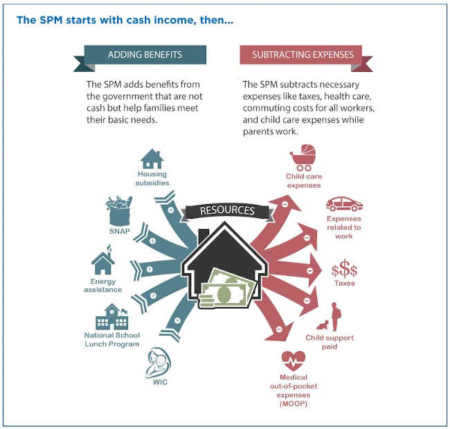 The second — the Supplemental Poverty Measure (SPM) — includes both cash and noncash benefits and subtracts necessary expenses (such as taxes and medical expenses).