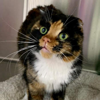 “Chowder” is a 4-year-old female domestic shorthair cat with a calico coat.