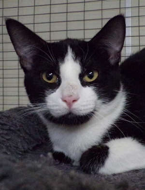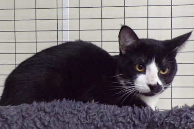 “Blackette” is a young male domestic shorthair with a black and white coat.