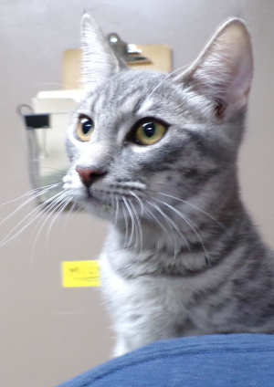 This young male domestic shorthair has a unique striped gray tabby coat.