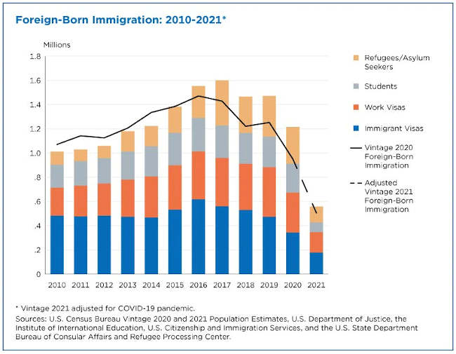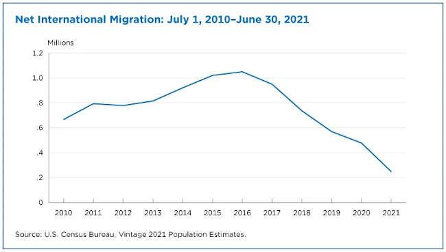 Net international migration, or NIM, added 247,000 to the nation's population between 2020 and 2021, according to U.S. Census Bureau July 1, 2021 population estimates released today.
