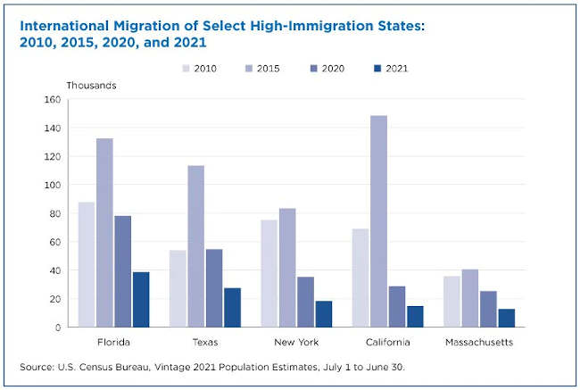 Florida, Texas, New York, California, and Massachusetts typically gain the most migrants from abroad and comprise about half of NIM for the nation most years.