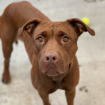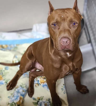 “Bruce” is a 2-year-old male pit bull terrier with a short brown coat.