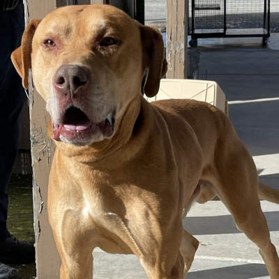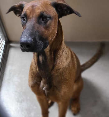 “Duke is a 1-year-old male Rhodesian ridgeback with a short brown coat.