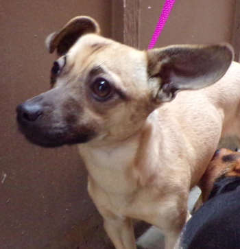 “Nugget” is a male Chihuahua mix puppy with a short tan coat.