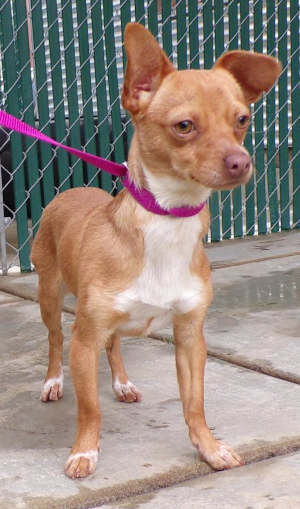 “Brownie” is a young male Chihuahua mix with a red and white coat.