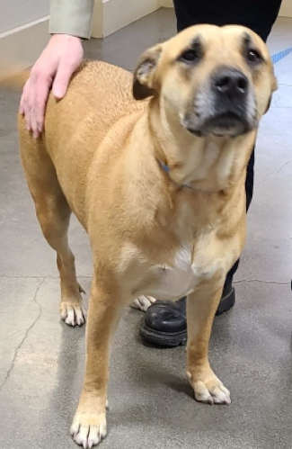 This 5-year-old female black mouth cur-Labrador retriever mix has a golden coat with white markings.