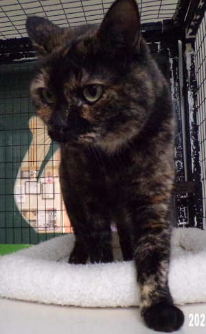 “Dinky” is a 10-year-old female domestic shorthair cat with a tortie coat.