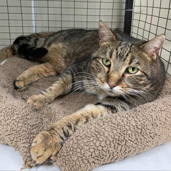 “Brutus” is a 6-year-old male domestic shorthair with a brown tabby coat.