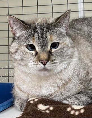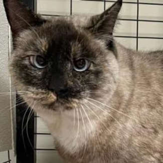“Coco” is a 3-year-old female Siamese mix with a short gray, black and white coat, and blue eyes.