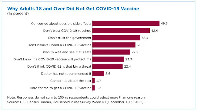 According to the U.S. Census Bureau’s newest phase of the experimental Household Pulse Survey, or HPS, those who were unvaccinated against COVID in early December 2021, reported a variety of reasons why.
