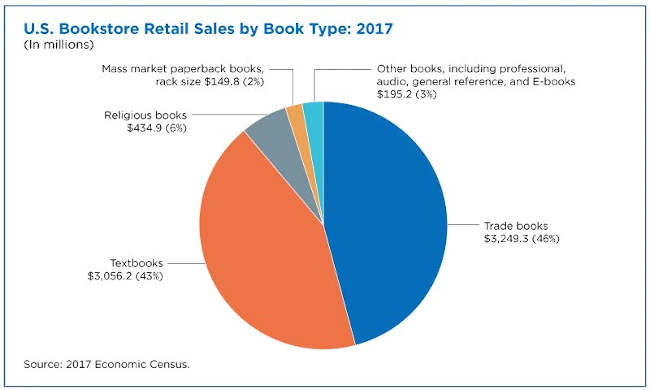 About 90% of bookstores’ total retail book sales in 2017 were for trade books and textbooks. The remaining 10% included religious books, mass market paperbacks, professional books, and others.