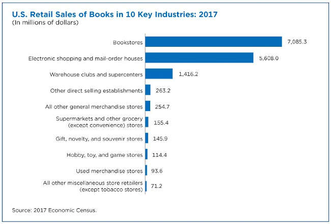 Clearly bookstores are the go-to for many book lovers. But they can also satisfy their thirst for reading at 50 or more other types of businesses, including Electronic Shopping and Mail Order Houses, Warehouse Clubs and Supercenters, and Other Direct Selling outlets. In fact, book sales ($8.3 billion) of businesses other than bookstores were similar to those made in bookstores in 2017.