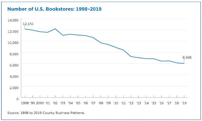 According to data from the Census Bureau’s County Business Patterns, while the number of U.S. Book stores (as listed in the North American Industry Classification System) dropped from 12,151 in 1998 to 6,045 in 2019, there were still more bookstores than some other types of retail businesses that are ubiquitous in our communities, including Home Centers (5,952 establishments) and Department Stores (3,856).