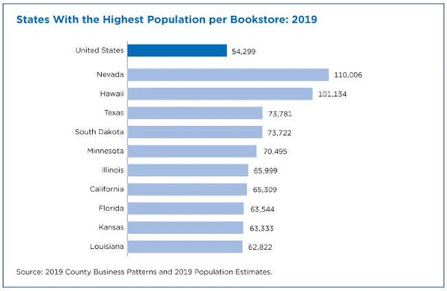 On average, there was one bookstore per 54,299 people in the United States in 2019. Nevada had the nation’s fewest number of bookstores per capita — one for every 110,006 state residents — perhaps making it an underserved market that could potentially support new bookstores.