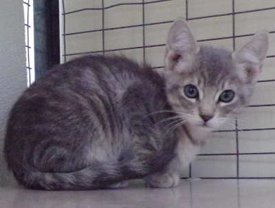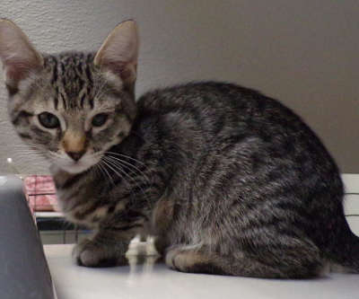 This female domestic shorthair kitten has a gray tabby coat.