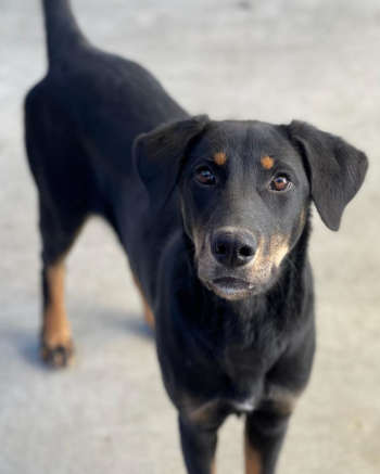 This young Female Doberman-Labrador mix has a short black and tan coat.