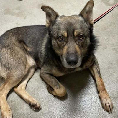 “Skoutt” is a 6-year-old male shepherd mix with a short tricolor coat.