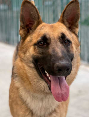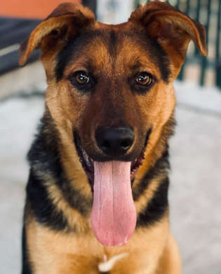 This 2-year-old male shepherd mix has a short black and tan coat.