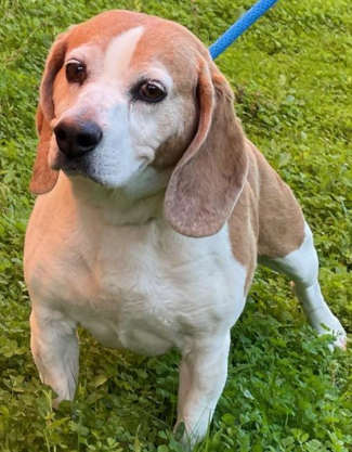“Buster” is a 5-year-old beagle with a short red and white coat.