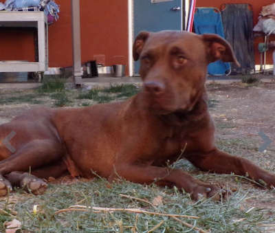 This 5-year-old female chocolate Labrador retriever-pit bull mix has a short chocolate-colored coat.