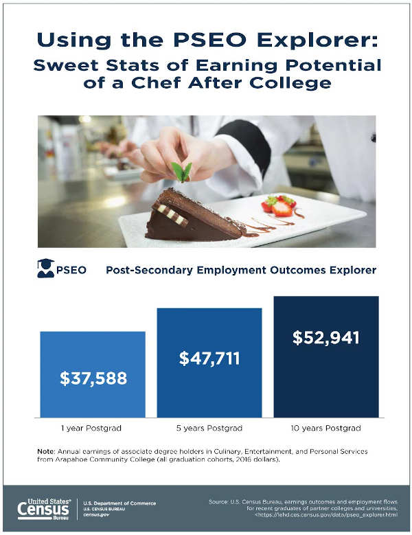 The U.S. Census Bureau recently released an infographic that features data on annual earnings of associate degree holders in the culinary, entertainment and personal services industries, using graduates from the Arapahoe Community College of Colorado as an example.
