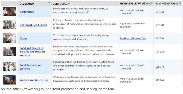 According to the Bureau of Labor Statistics Occupational Outlook Handbook, employment in food preparation and service-related fields is expected to grow by 20% from 2020 to 2030, gaining about 2.3 million jobs over the next decade. Median annual pay for food preparation and serving-related occupations was $25,500 in May 2020.