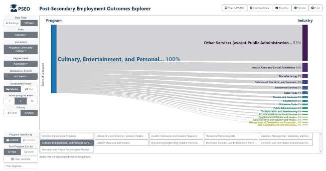Aspiring chefs can use the PSEO Explorer to find out which industry sector of employment Culinary, Entertainment, and Personal Services graduates are choosing. They can glean information on geographical dispersion, too.