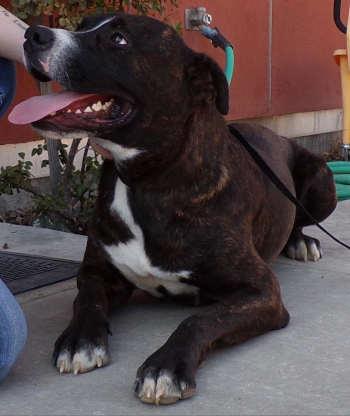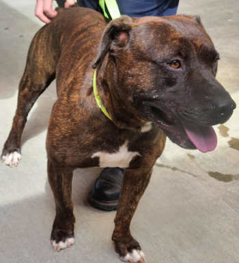 This 2-year-old male pit bull terrier mix has a short brindle coat.
