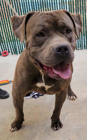 ‘Dozer’ is a 5-year-old American pit bull terrier mix with a short brindle coat.