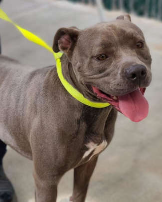 This 1-year-old male pit bull terrier mix has a short gray coat.