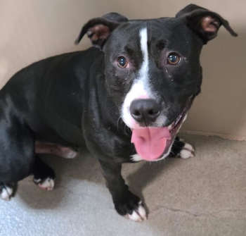 This 2-year-old male pit bull terrier mix has a short black coat with white markings.