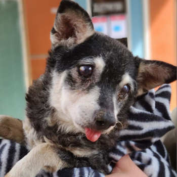 “Topolina” is a 10-year-old male Chihuahua mix with a short black coat with white markings.