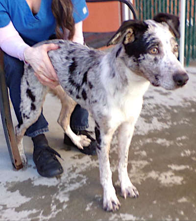This young female Australian shepherd mix has a blue merle coat.