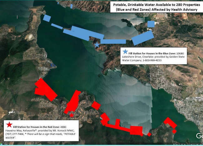 • Fill station for houses in the blue zone: 10680 Lakeshore Drive, Clearlake: provided by Golden State Water Co., 1-800-999-4033;
