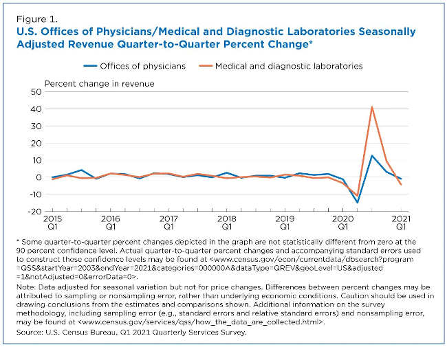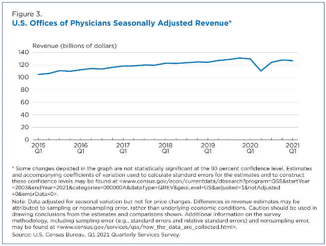 In contrast, total revenue for Offices of Physicians was approximately $129.5 billion in the first quarter of 2020 and $126.7 billion in the first quarter of 2021 — a year-over-year change that is not significant (Figure 3).