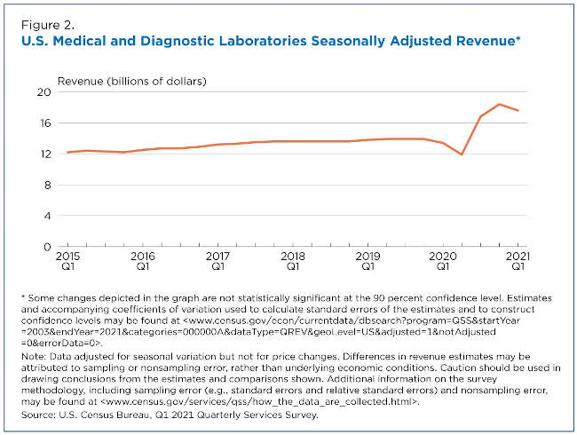 Total revenue of Medical and Diagnostic Laboratories increased 9.4% from $16.8 billion in the third quarter to $18.4 billion in the fourth quarter of 2020. But it fell 4.3% to $17.6 billion in the first quarter of 2021.