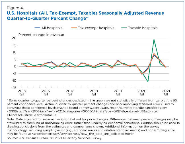 The quarter-to-quarter percentage changes for the hospital industry closely mirror its largest subset: tax-exempt hospitals that make up approximately 88% of the industry (Figure 4).