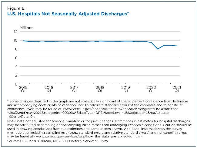 Hospital discharges dropped 15.9% from approximately 9.5 million in the first quarter of 2020 to 8.0 million in the second quarter of 2020. By the first quarter of 2021, there were 8.7 million discharges (Figure 6).