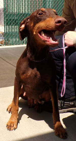 “Peanut” is a 1-year-old female Doberman Pinscher with a short red and tan coat.