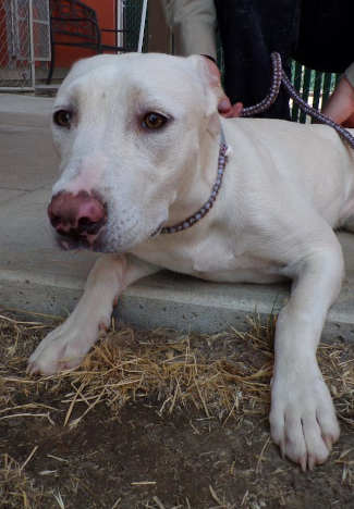 This 4-year-old female pit bull terrier mix has a short white coat.