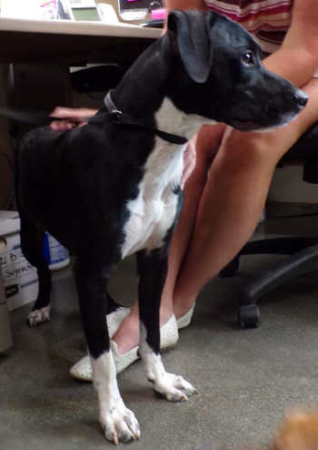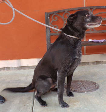 “Shamus McGee” is an 8-year-old male Labrador retriever mix with a short black coat.
