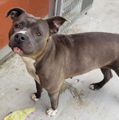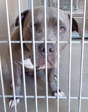 “Dusty” is a 2-year-old female pit bull terrier mix with a short gray coat.