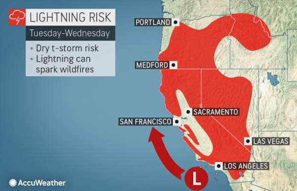 "This circulation will tend to spread the thunderstorm risk into areas that have already been hammered by wildfires so far this summer in Northern California, northern Nevada, Oregon and Idaho as the week progresses," Benz said.