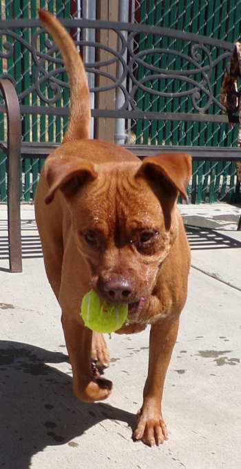 “Luna” is a 3-year-old female pit bull terrier mix with a short red coat.