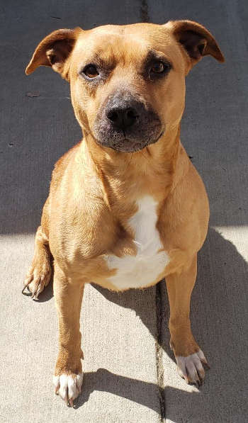 “Happy” is a 3-year-old female pit bull mix with a short tan coat.