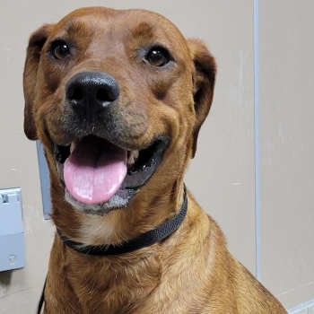 “Dash” is a 2-year-old female Rhodesian Ridgeback mix with a short tan coat.